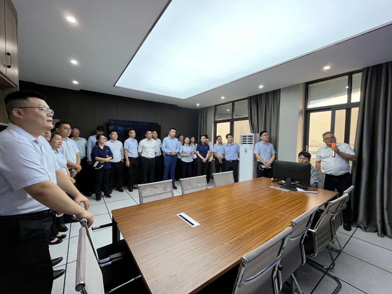 集團(tuán)郭總在我司講解團(tuán)的陪同下,帶領(lǐng)集團(tuán)年輕干部培訓(xùn)班成員先后參觀了我司機(jī)械、電氣生產(chǎn)車間、成品庫(kù)、二次供水設(shè)備展廳、二次供水監(jiān)控管理平臺(tái)及數(shù)字化智慧水務(wù)平臺(tái)。